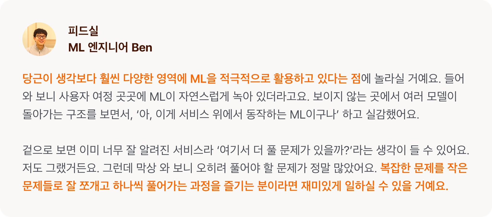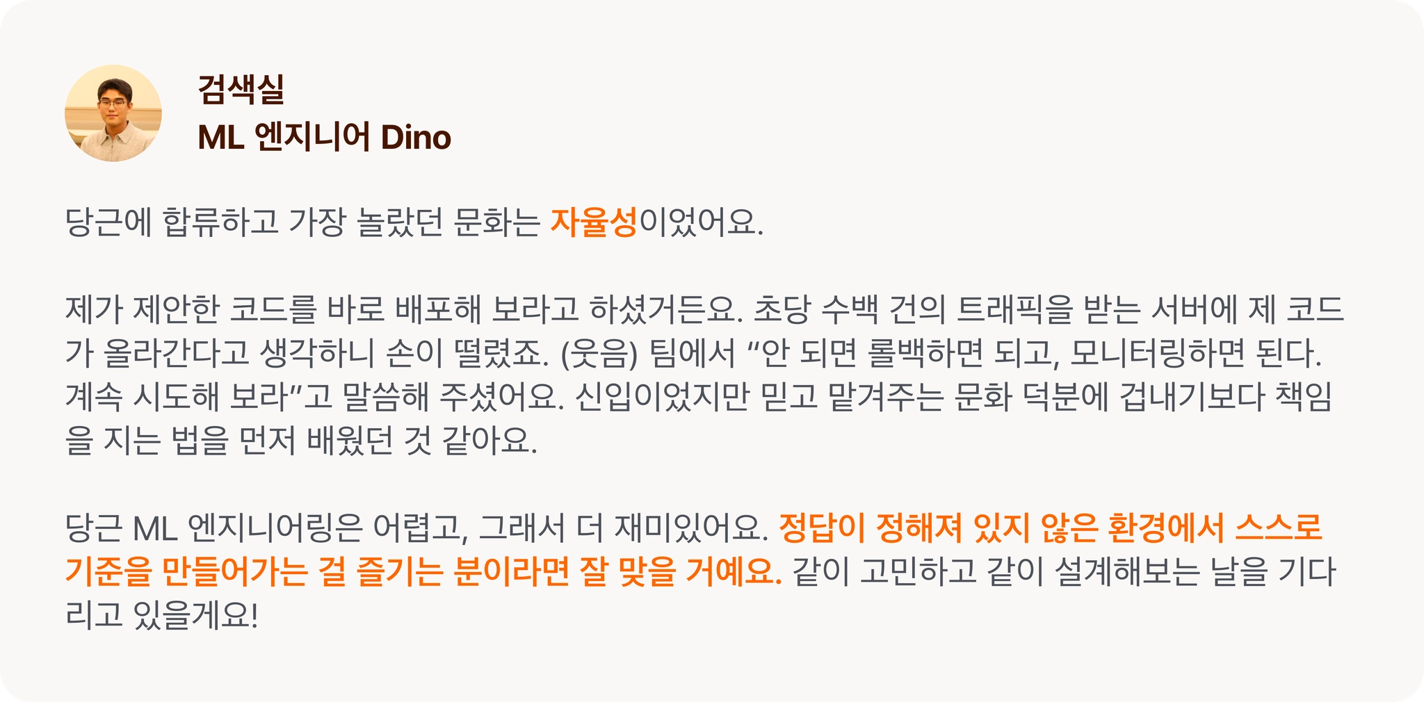수천만 유저의 실제 행동을 움직이는 모델을 설계하고 싶다면 성능·속도·비용·사용자 경험 사이의 현실적인 균형을 찾는 문제를 해결하고 싶다면 높은 자율성과 빠른 실행 속도 속에서 직접 임팩트를 만들어내고 싶다면 당근 ML 엔지니어로 지금 합류하세요!